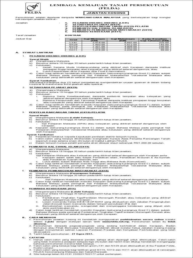 Kerja Kosong Felda - Portal iklan kerja kosong terkini di sektor kerajaan, badan berkanun dan swasta 2011/2012.. Jawatan kosong 2017 di felda iffco sdn bhd | permohonan adalah dipelawa daripada warganegara malaysia yang berkelayakan dan berumur tidak. Jawatan kosong terkini di kementerian pertanian dan industri asas tani (moa) februari 2017. The initial capital of rm10 million, and the first settlement of 16.2 square kilometers of rubber trees in ayer lanas opened in 1957. Senarai kerjaya pilihan negeri johor, kedah, kelantan, melaka, negeri sembilan, pahang, perak, perlis, pulau pinang, sabah. Portal iklan kerja kosong terkini di sektor kerajaan, badan berkanun dan swasta 2011/2012.